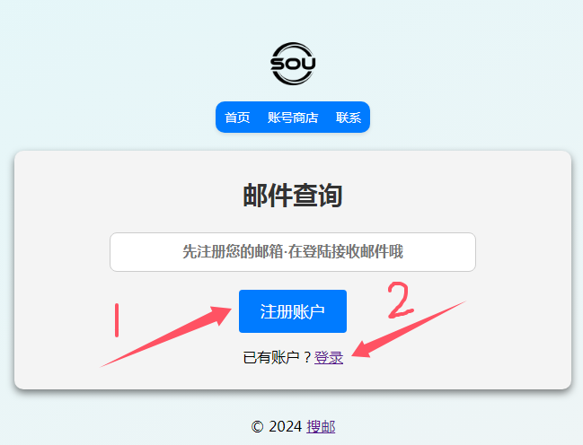 打开地址:https://www.sou.email/。使用账号在这里简单注册一下。设置个密码。然后点击2.使用设置密码登录获取6位验证码。返回登录